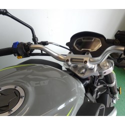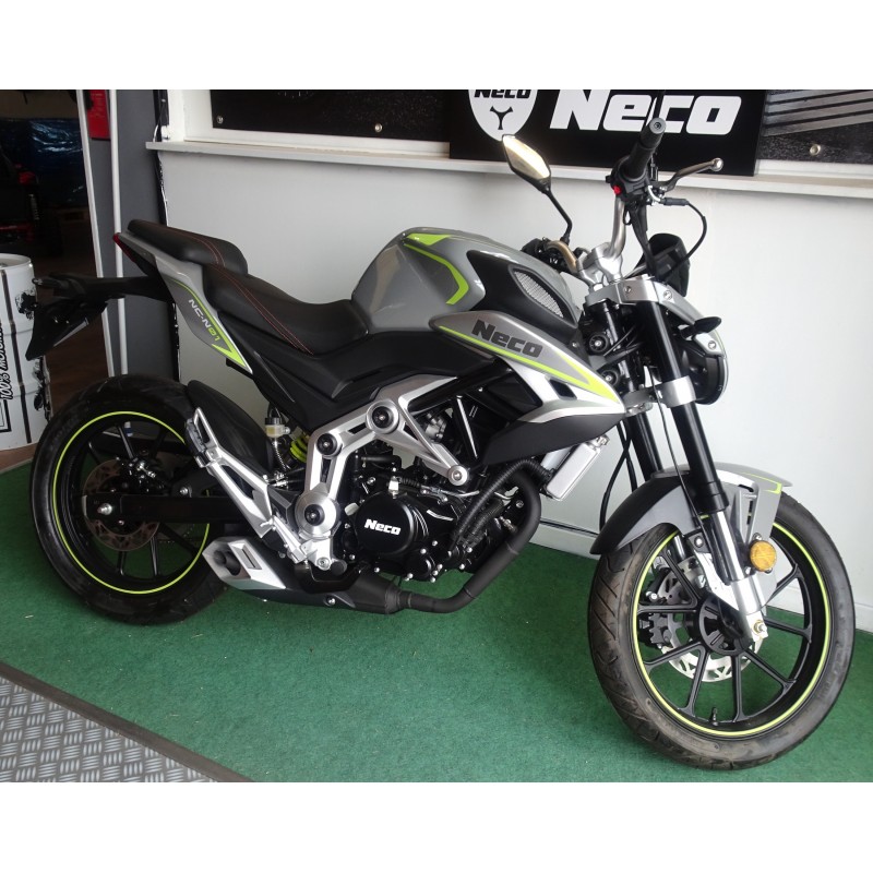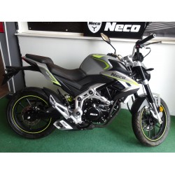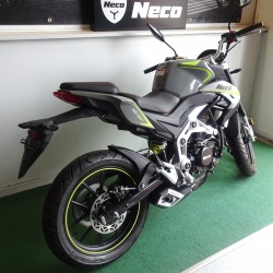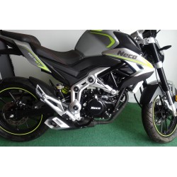 Neco, connu pour ses scooters, se lance maintenant sur la moto avec cette 125 roadster moderne. la NC-N01 est doté d'un moteur 4 temps à refroidissement liquide, coiffé d'une culasse 4 soupapes, double arbre, il délivre ses 15 chevaux et un couple généreux procurant de belles accélérations. Contrairement aux apparence, le cadre n'est pas en aluminium, mais un simple treillis tubulaire avec suelement le bras oscillant en alu. Le mono-amortisseur central assure la suspension arrière alors que la fourche inversé de gros diamètre conforte le train avant. c'est un roadster 125 sportif qui nous est proposé par Neco avec ses freins à disque pétales couplés, ses jantes avec filet coloré et sa selle à deux étages. Les feux à leds sont de mise ainsi qu'un écran LCD.